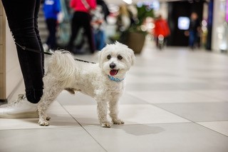 Guterzogene Hunde sind angeleint auf den allgemeinen Flächen im KÖWE-Einkaufszentrum erlaubt.